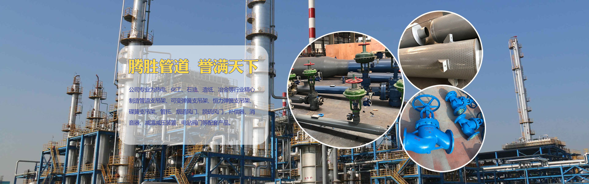 公司专业为热电、化工、石油、造纸、冶金等行业精心制造管道支吊架、可变弹簧支吊架、恒力弹簧支吊架、碟簧支吊架、管托、烟道风门、脱硫风门,补偿器、消音器、减温减压装置、电站阀门等配套产品。